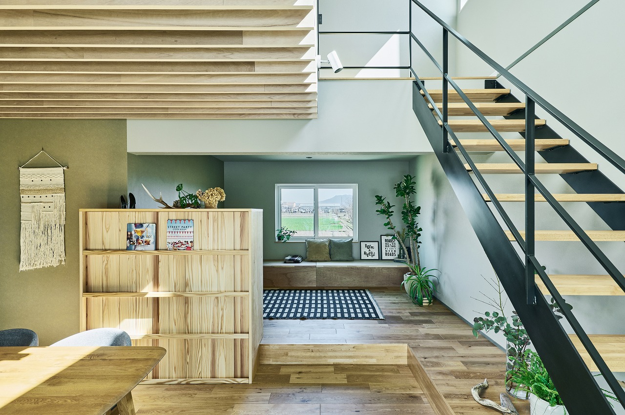 インナーガレージのある平屋のカリフォルニアスタイル
